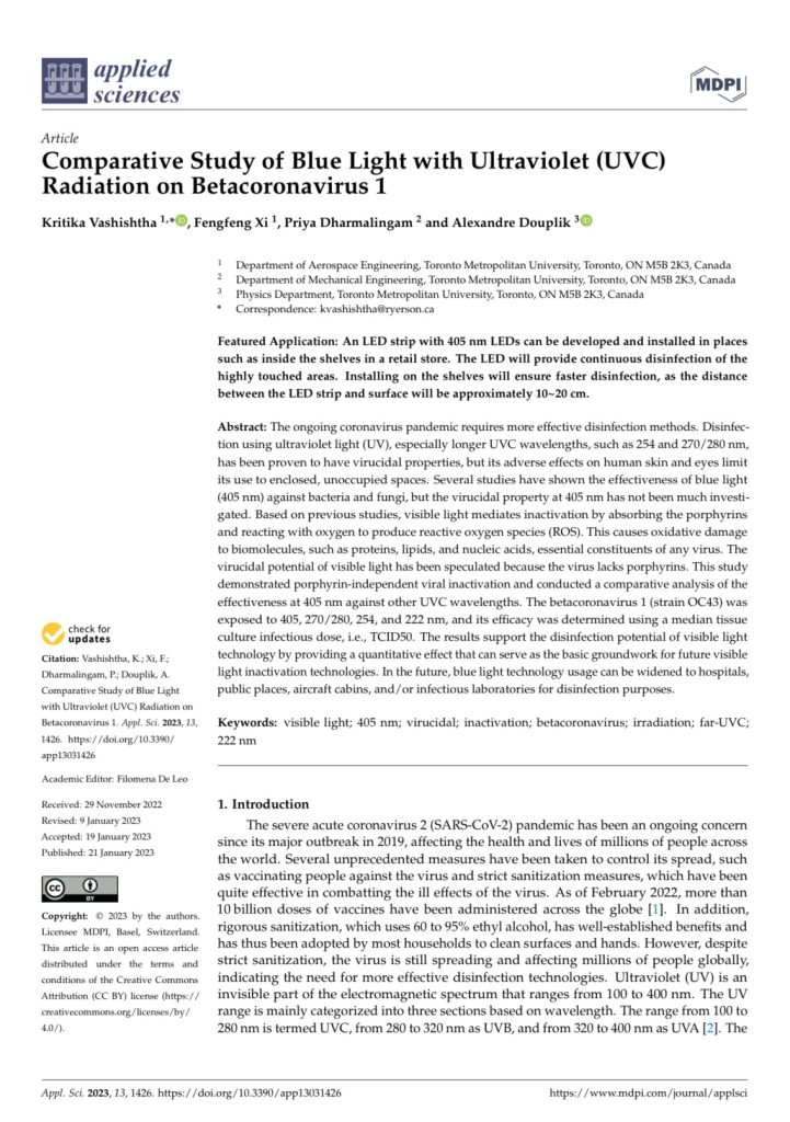 Vashishtha, K., Xi, F., Dharmalingam, P., & Douplik, A. (2023). Comparative Study of Blue Light with Ultraviolet (UVC) Radiation on Betacoronavirus 1. Applied Sciences, 13(3), 1426.